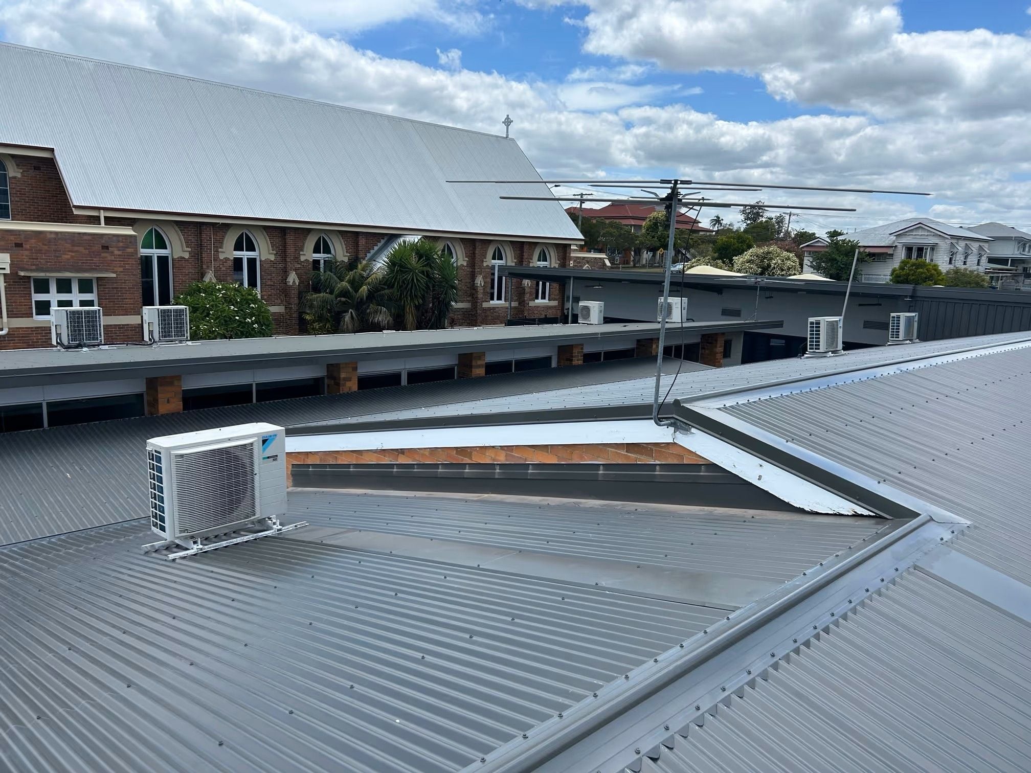 To modernise and secure the roof further, we installed new flashings, ridge capping, and custom-fabricated dry pans at all major penetrations (such as AC units and PVC pipes), ensuring complete compliance with regulation. Outdated foam gutter guards were replaced with a modern system tailored to the school's environment, accompanied by a maintenance plan for ongoing management of tree debris.